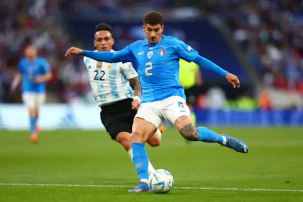 LONDON, ENGLAND - JUNE 01: Giovanni Di Lorenzo of Italy has a shot during the 2022 Finalissima match between Italy and Argentina at Wembley Stadium on June 01, 2022 in London, England. (Photo by Alex Pantling/Getty Images)