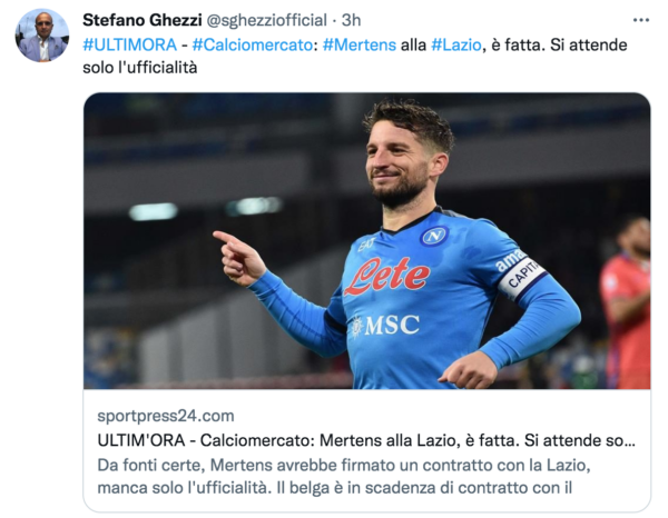Stando a quanto rivelato da Sportpress24, Dries Mertens avrebbe addirittura già firmato col club biancoceleste e ora mancherebbe sola l’ufficialità per sancire il trasferimento. Ciò che lo spingerebbe a lasciare Napoli è la politica adottata da Aurelio De Laurentiis con la diminuzione di ingaggio, il cui sarebbe inferiore a quello proposto dalla società laziale.