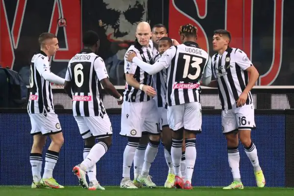Udinese's Portuguese forward Beto (3rdR) celebrates with teammates after scoring his team's first goal during the Serie A football match between Udinese and AC Milanat the Dacia Arena stadium in Udine on December 11, 2021 . (Photo by Marco BERTORELLO / AFP) (Photo by MARCO BERTORELLO/AFP via Getty Images)