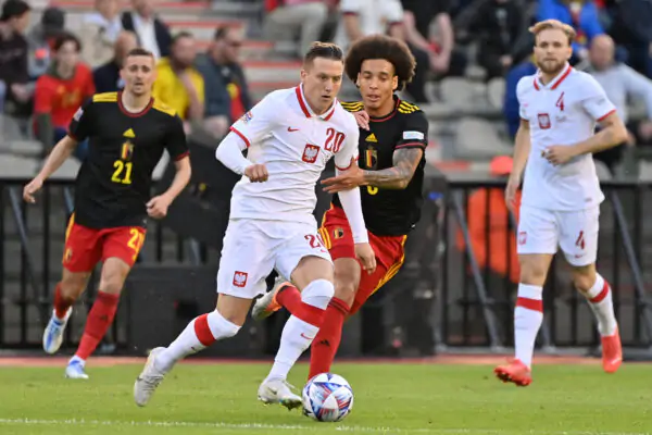 Poland's Piotr Zielinski and Belgium's Axel Witsel fight for the ball during a soccer game between Belgian national team the Red Devils and Poland, Wednesday 08 June 2022 in Brussels, the second game (out of six) in the Nations League A group stage. BELGA PHOTO DIRK WAEM (Photo by DIRK WAEM / BELGA MAG / Belga via AFP) (Photo by DIRK WAEM/BELGA MAG/AFP via Getty Images)
