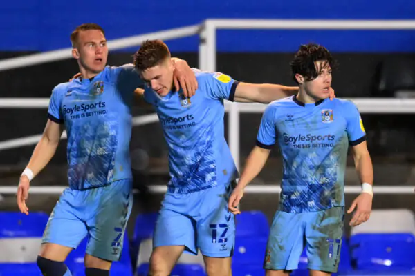BIRMINGHAM, ENGLAND - JANUARY 27: Viktor Gyokeres of Coventry City celebrates with team mates (L - R) Leo Skiri Ostigard and Callum O'Hare after scoring their side's first goal during the Sky Bet Championship match between Coventry City and Sheffield Wednesday at St Andrew's Trillion Trophy Stadium on January 27, 2021 in Birmingham, England. Sporting stadiums around the UK remain under strict restrictions due to the Coronavirus Pandemic as Government social distancing laws prohibit fans inside venues resulting in games being played behind closed doors. (Photo by Clive Mason/Getty Images)