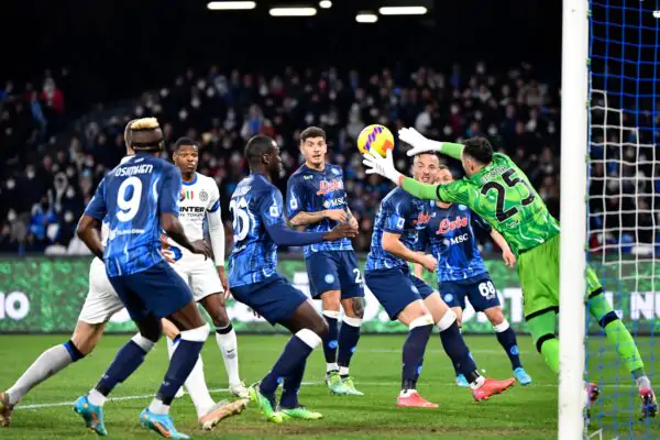 Napoli's Colombian goalkeeper David Ospina jumps to block the ball during the Italian Serie A football match between SCC Napoli and Inter Milan at the Stadio Diego Armando Maradona stadium in Naples on February 12, 2022. (Photo by Alberto PIZZOLI / AFP) (Photo by ALBERTO PIZZOLI/AFP via Getty Images)