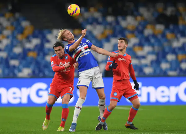 NAPLES, ITALY - JANUARY 09: Morten Thorsby of UC Sampdoria heads the ball under pressure from Diego Demme and Eljif Elmas of SSC Napoli during the Serie A match between SSC Napoli v UC Sampdoria at Stadio Diego Armando Maradona on January 09, 2022 in Naples, Italy. (Photo by Francesco Pecoraro/Getty Images)