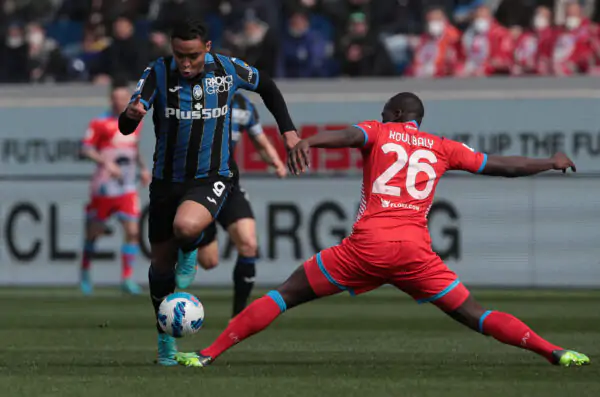 BERGAMO, ITALY - APRIL 03: Luis Muriel of Atalanta BC is challenged by Kalidou Koulibaly of SSC Napoli during the Serie A match between Atalanta BC and SSC Napoli at Gewiss Stadium on April 03, 2022 in Bergamo, Italy. (Photo by Emilio Andreoli/Getty Images)