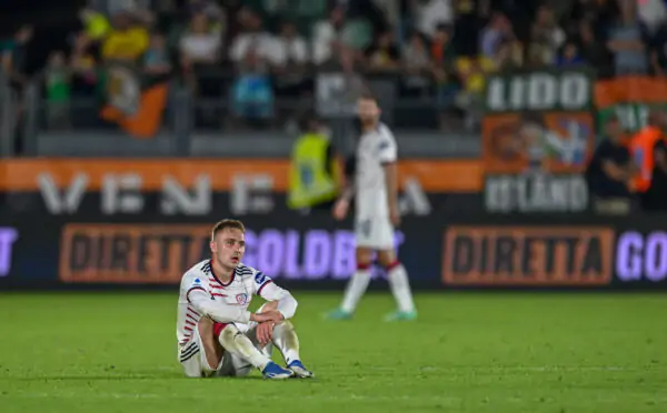 VENICE, ITALY - MAY 22: Marco Rog of Cagliari shows his dejection after the Serie A match between Venezia FC and Cagliari Calcio at Stadio Pier Luigi Penzo on May 22, 2022 in Venice, Italy. (Photo by Getty Images/Getty Images)