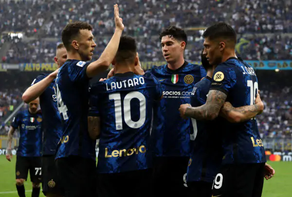 MILAN, ITALY - MAY 22: Joaquin Correa of FC Internazionale celebrates with Ivan Perisic (L) and teammates after scoring their side's third goal during the Serie A match between FC Internazionale and UC Sampdoria at Stadio Giuseppe Meazza on May 22, 2022 in Milan, Italy. (Photo by Marco Luzzani/Getty Images)