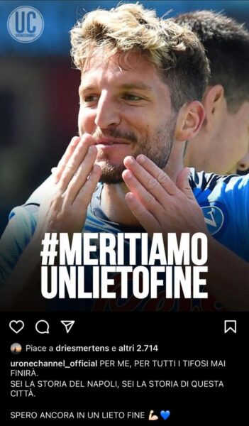 La speranza, però, è l’ultima a morire. Lo stesso Mertens sembra intenzionato a proseguire la propria avventura con la casacca del Napoli. Il calciatore ha mandato un messaggio indiretto alla piazza mettendo like ad un post su Instagram che recitava: “Meritiamo un lieto fine”, facendo riferimento alla storia d’amore tra Dries Mertens e i tifosi azzurri.