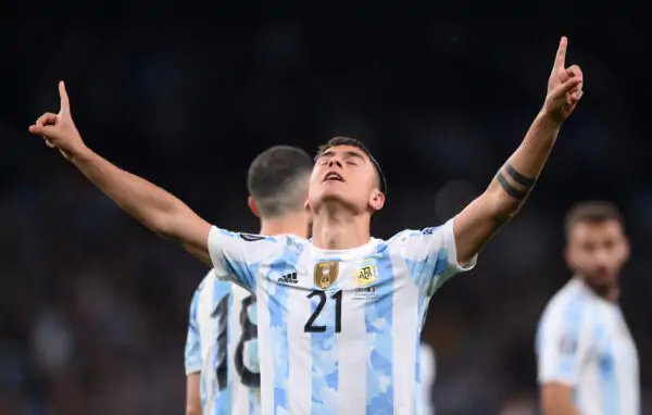 LONDON, ENGLAND - JUNE 01: Paulo Dybala of Argentina celebrates after their sides victory during the 2022 Finalissima match between Italy and Argentina at Wembley Stadium on June 01, 2022 in London, England. (Photo by Shaun Botterill/Getty Images)