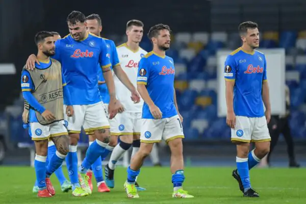 (From L) Napoli's Italian forward Lorenzo Insigne, Napoli's Italian forward Andrea Petagna, Napoli's Belgian forward Dries Mertens and Napoli's German midfielder Diego Demme celebrate at the end of the UEFA Europa League Group C Football match between Napoli and Legia Warsaw on October 21, 2021 at the Diego-Maradona stadium in Naples. (Photo by Tiziana FABI / AFP) (Photo by TIZIANA FABI/AFP via Getty Images)