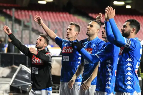 (From L) Napoli's Belgian forward Dries Mertens, Napoli's Polish forward Arkadiusz Milik, Napoli's Serbian defender Nikola Maksimovic, Napoli's Spanish midfielder Fabian Ruiz and Napoli's Spanish defender Raul Albiol acknowledge fans at the end of the Italian Serie A football match Napoli vs Lazio Roma on January 20, 2019 at the San Paolo stadium in Naples. (Photo by Carlo Hermann / AFP) (Photo credit should read CARLO HERMANN/AFP via Getty Images)