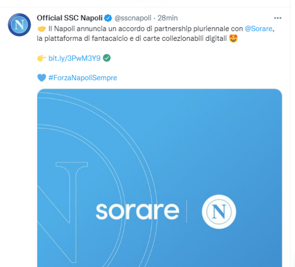 Questo il tweet del Napoli in cui è stata ufficializzata definitivamente la partnership con Sorare:
