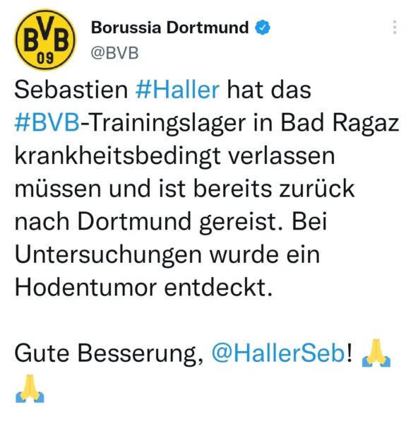 “Sebastien Haller ha dovuto lasciare il ritiro del #BVB a Bad Ragaz a causa di un malessere ed è già stato riportato a Dortmund. Durante gli esami è stato scoperto un tumore ai testicoli. Riprenditi presto”.