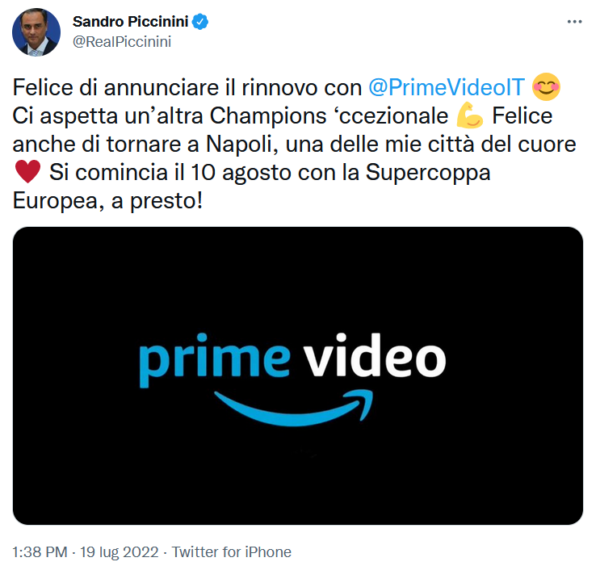 Sandro Piccinini sarà ancora al commento per Prime Video nel corso della stagione 2022/23. Il telecronista commenterà le gare di Champions League e ha voluto dare la notizia stesso lui attraverso i suoi profili social: bellissimo messaggio anche per la città di Napoli. Queste le sue parole: