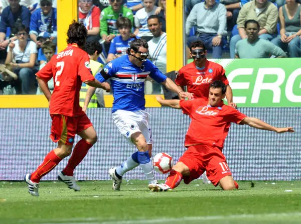 GENOA, ITALY - MAY 16: Daniele Mannini of UC Sampdoria battles for the ball against Gianluca Grava and Christian Maggio of SSC Napoli during the Serie A match between UC Sampdoria and SSC Napoli at Stadio Luigi Ferraris on May 16, 2010 in Genoa, Italy. (Photo by Massimo Cebrelli/Getty Images)
