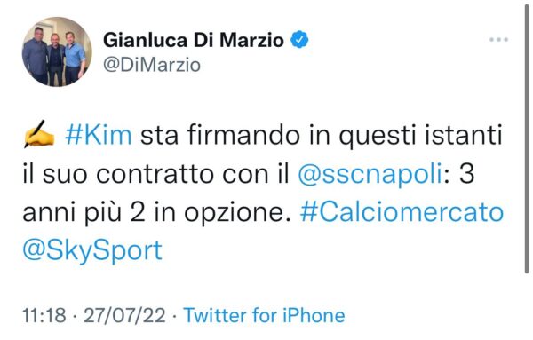“Kim sta firmando in questi istanti il suo contratto con il Napoli: 3 anni più 2 in opzione“.