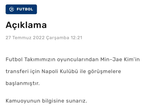 “Sono iniziate le trattative con il Napoli Club per il trasferimento di Min-Jae Kim, uno dei giocatori della nostra squadra di calcio. Lo presentiamo al pubblico“.