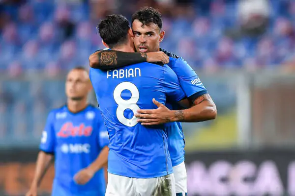 GENOA, ITALY - AUGUST 29: Andrea Petagna of Napoli (R) celebrates with his team-mate Fabian Ruiz after the Serie A match between Genoa Cfc and Ssc Napoli at Stadio Luigi Ferraris on August 29, 2021 in Genoa, Italy. (Photo by Getty Images)