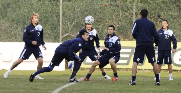 (From L) SSC Napoli's Ignacio Fideleff, Antonio Rosati, Salvatore Aronica and Christian MAggio play the ball during a training session on the eve of their Champions League Group A football match on November 21, 2011 at the SSC Napoli's training center in Castelvolturno. AFP PHOTO / ROBERTO SALOMONE (Photo credit should read ROBERTO SALOMONE/AFP via Getty Images)