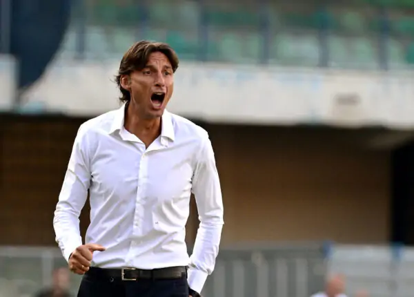 Hellas Verona's Italian coach Gabriele Cioffi reacts during the Italian Serie A football match between Hellas Verona and Napoli on August 15, 2022 at the Bentegodi stadium in Verona. (Photo by Miguel MEDINA / AFP) (Photo by MIGUEL MEDINA/AFP via Getty Images)
