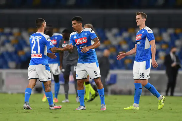 NAPLES, ITALY - JULY 19: Matteo Politano, Allan and Arkadiusz Milik of SSC Napoli celebrate the 2-1 goal scored by Matteo Politano during the Serie A match between SSC Napoli and Udinese Calcio at Stadio San Paolo on July 19, 2020 in Naples, Italy. (Photo by Francesco Pecoraro/Getty Images)