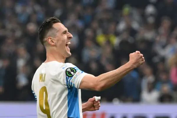 Marseille's Polish forward Arkadiusz Milik celebrates scoring his team's first goal during the UEFA Europa Conference League match between Marseille (OM) and FC Basel at the Velodrome stadium in Marseille, southern France, on March 10, 2022. (Photo by Nicolas TUCAT / AFP) (Photo by NICOLAS TUCAT/AFP via Getty Images)