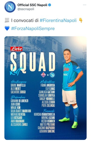 Regolarmente presenti anche i nuovi acquisti, tra i quali Giacomo Raspadori e Giovanni Simeone, che questa volta potrebbero trovare anche a gara in corso, così come annunciato dallo stesso Luciano Spalletti in conferenza.