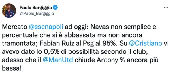 Prosegue poi Bargiggia su Twitter annunciando che si complica ulteriormente anche la pista per l’affare Navas, ma nonostante tutto rimane ancora qualche spiraglio per la società azzurra. Mentre su Fabian – stando a quanto riportato dal giornalista – sarebbe quasi fatta con il club parigino.