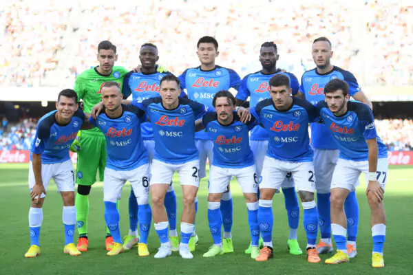 NAPLES, ITALY - AUGUST 21: Players of Napoli pose for a team photograph prior to kick off of the Serie A match between Napoli and Monza at Stadio Diego Armando Maradona on August 21, 2022 in Naples, Italy. (Photo by Francesco Pecoraro/Getty Images)