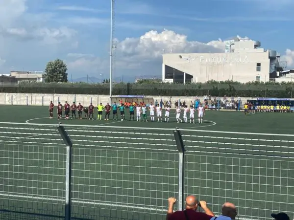 Il match per lunghi tratti è stato equilibrato, con i granata che si sono lasciati preferire nella prima frazione di gioco. Un primo tempo in cui c’è da evidenziare la traversa colpita da capitan Rega all’alba della mezz’ora, su calcio d’angolo perfettamente battuto da Raffaele Russo. Anche la squadra avversaria si è fatta notare andando in gol, successivamente annullata per offside. Al 35′ però Guido Abayan è salito in cattedra e, come anticipato, ha realizzato di testa il gol del vantaggio. L’argentino è stato abile a ribadire in rete il pallone che precedentemente (su un tiro di Scognamiglio) aveva scheggiato la traversa.