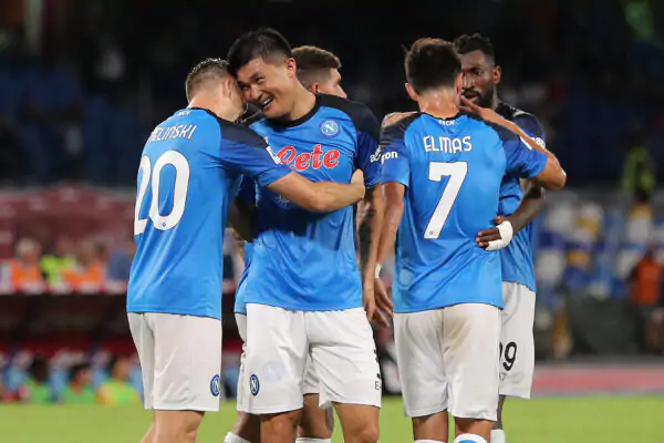 NAPLES, ITALY - AUGUST 21: Kim Min-Jae of Napoli celebrates scoring their side's fourth goal with teammates during the Serie A match between Napoli and Monza at Stadio Diego Armando Maradona on August 21, 2022 in Naples, Italy. (Photo by Francesco Pecoraro/Getty Images)