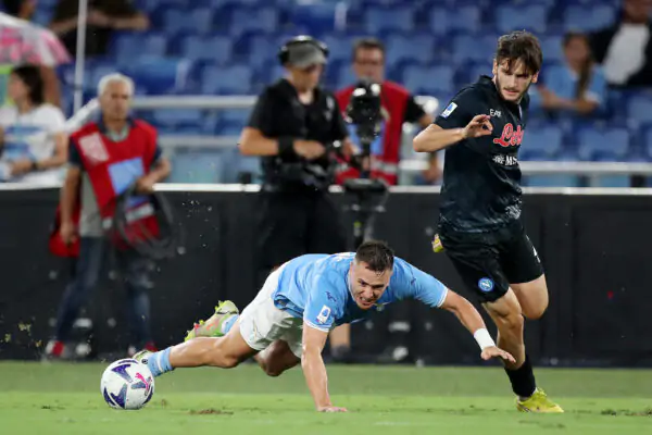 ROME, ITALY - SEPTEMBER 03: Patric of SS Lazio is challenged by Khvicha Kvaratskhelia of Napoli during the Serie A match between SS Lazio and SSC Napoli at Stadio Olimpico on September 03, 2022 in Rome, Italy. (Photo by Paolo Bruno/Getty Images)