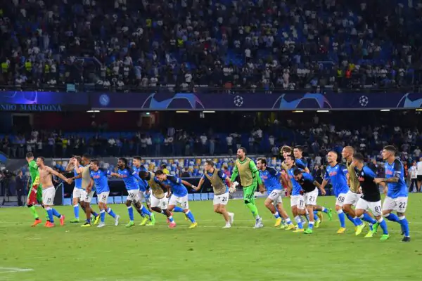 Napoli's players celebrate after winning the UEFA Champions League Group A first leg football match between SSC Napoli and Liverpool FC at the Diego Armando Maradona Stadium in Naples on September 7, 2022. (Photo by Alberto PIZZOLI / AFP) (Photo by ALBERTO PIZZOLI/AFP via Getty Images)