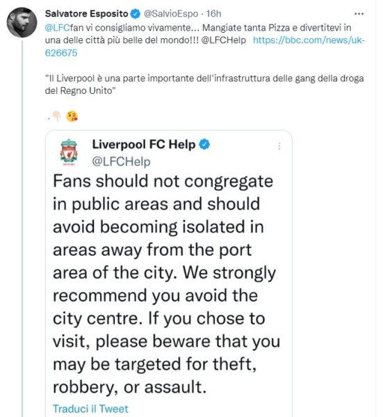 Salvatore Esposito, famoso attore napoletano che ha interpretato Genny Savastano in Gomorra, ha risposto alla provocazione lanciata nella giornata di ieri dal Liverpool dove invitava ai propri tifosi di fare attenzione alla città di Napoli e di evitare il centro della città. L’attore napoletano ha risposto con un tweet dove ha esortato i supporters dei Red’s di godersi la città e di mangiare tanta pizza. Questa la risposta: ” Liverpool fan, vi consigliamo vivamente…. Mangiate tanta Pizza e divertitevi in una delle città più belle del mondo.”