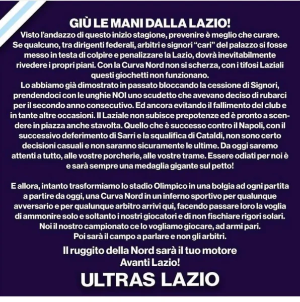 Le gocce che hanno fatto traboccare il vaso quindi, soprattutto sponda laziali, con gli ultras della Curva Nord – parte più calda del tifo – che nella giornata di oggi hanno alzato la voce tramite un comunicato apparso sui propri canali ufficiali: “Se qualcuno, tra dirigenti federali, arbitri e signori “cari” del palazzo si fosse messo in testa di colpire e penalizzare la Lazio, dovrà inevitabilmente rivedere i propri piani. Con la Curva Nord non si scherza, con i tifosi laziali questi giochetti non funzionano” – si legge in una prima parte del comunicato -. Che prosegue: “Quello che è successo contro il Napoli, con il successivo deferimento di Sarri e la squalifica di Cataldi, non sono certo decisioni casuali e non saranno sicuramente le ultime” – si continua poi a scorrere -. “Essere odiati per noi è e sarò sempre una medaglia gigante sul petto” – scrivono ancora, per poi concludere: “Noi il nostro campionato lo vogliamo giocare, ad armi pari. Poi sarà il campo a parlare e non gli arbitri. Il ruggito della Nord sarà il tuo motore. Avanti Lazio”.