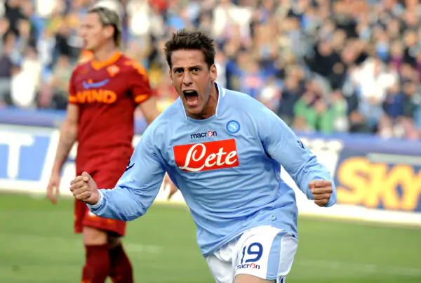 SSC Napoli's German Denis celebrates after scoring during their Serie A football match SSC Napoli vs AS Roma at San Paolo Stadium in Naples on February 28, 2010. AFP PHOTO / ROBERTO SALOMONE (Photo credit should read ROBERTO SALOMONE/AFP via Getty Images)