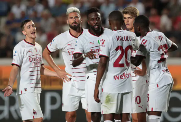 BERGAMO, ITALY - AUGUST 21: Divock Origi of AC Milan speaks with his teammates during the Serie A match between Atalanta BC and AC Milan at Gewiss Stadium on August 21, 2022 in Bergamo, . (Photo by Emilio Andreoli/Getty Images)