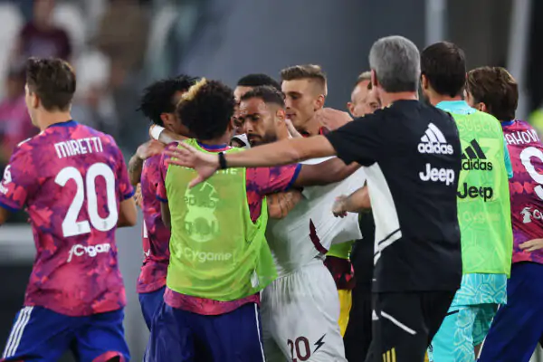 TURIN, ITALY - SEPTEMBER 11: Players of Juventus and Salernitana clash after Arkadiusz Milik (not pictured) of Juventus scored a goal which was later disallowed during the Serie A match between Juventus and Salernitana at on September 11, 2022 in Turin, Italy. (Photo by Jonathan Moscrop/Getty Images)