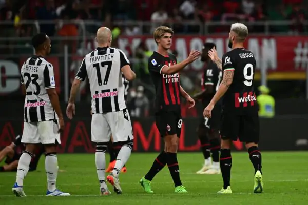 AC Milan's Belgian midfielder Charles De Ketelaere (C) and AC Milan's French forward Olivier Giroud tap hands at the end of the Italian Serie A football match between AC Milan and Udinese on August 13, 2022 at the San Siro stadium in Milan. (Photo by MIGUEL MEDINA / AFP) (Photo by MIGUEL MEDINA/AFP via Getty Images)
