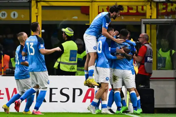 Napoli's players celebrate after opening the scoring during the Italian Serie A football match between AC Milan and Napoli on September 18, 2022 at the San Siro stadium in Milan. (Photo by MIGUEL MEDINA / AFP) (Photo by MIGUEL MEDINA/AFP via Getty Images)