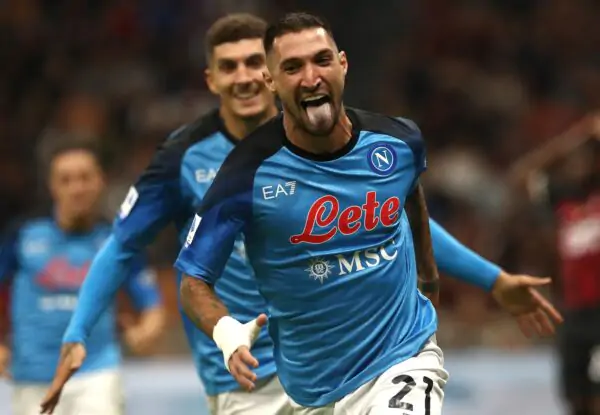 MILAN, ITALY - SEPTEMBER 18: Matteo Politano of SSC Napoli celebrates after scoring their team's first goal from the penalty spot during the Serie A match between AC Milan and SSC Napoli at Stadio Giuseppe Meazza on September 18, 2022 in Milan, Italy. (Photo by Marco Luzzani/Getty Images)