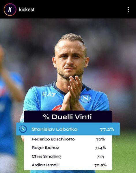 Come riportato sull’account ufficiale Instagram di Kickest, Stanislav Lobotka è il primo in Serie A per duelli vinti. Con ben il 77,2% di duelli vinti si piazza al primo posto in questa speciale classifica. Dunque per il numero 68 azzurro non solo tecnica ma anche tanta sostanza.