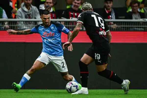 Napoli's Italian forward Matteo Politano (L) challenges AC Milan's French defender Theo Hernandez during the Italian Serie A football match between AC Milan and Napoli on September 18, 2022 at the San Siro stadium in Milan. (Photo by MIGUEL MEDINA / AFP) (Photo by MIGUEL MEDINA/AFP via Getty Images)