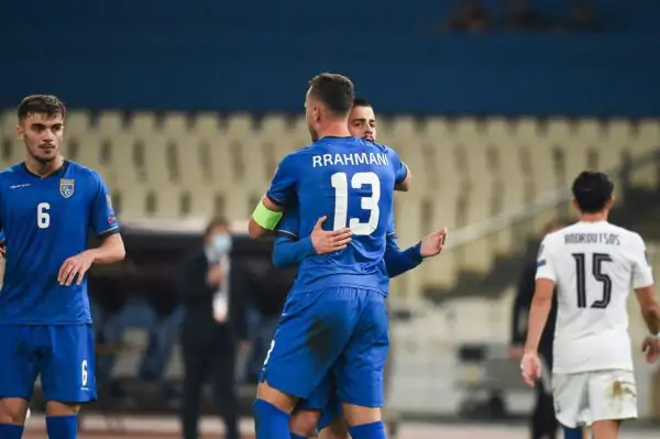 Kosovo's Amir Rrahmani celebrates with teammates after scoring a goal during the FIFA World Cup Qatar 2022 qualification football match between Greece and Kosovo at the OAKA Spiros Louis stadium in Athens on November 14, 2021. (Photo by Angelos Tzortzinis / AFP) (Photo by ANGELOS TZORTZINIS/AFP via Getty Images)