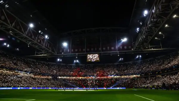 Spectators use their smartphone flashes ahead of the UEFA Champions League round of 16 second leg football match between Ajax and Benfica at the Johan Cruijff ArenA, in Amsterdam, on March 15, 2022. (Photo by MAURICE VAN STEEN / AFP) (Photo by MAURICE VAN STEEN/AFP via Getty Images)