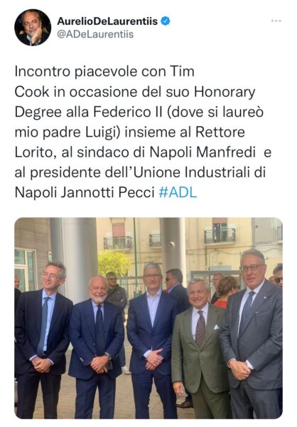 Diverse le figure di spessore presenti alla cerimonia di Cook, tra cui il sindaco Gaetano Manfredi, ma anche il presidente del Napoli Aurelio De Laurentiis che si è congratulato personalmente con il CEO della Apple: stretta di mano ferma e un chiaro “Congratulations”. De Laurentiis, poi, si è allontanato per lasciare spazio alle congratulazioni delle altre personalità presenti.