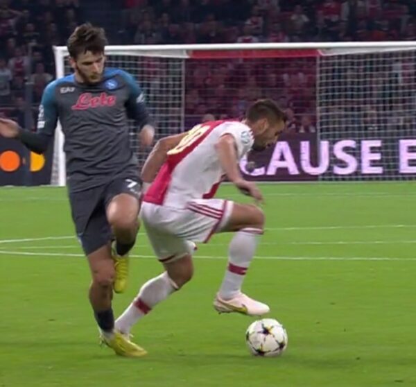 Proprio qualche minuto prima del gol però il numero 77 azzurro aveva subito una brutta tacchettata sulla caviglia da parte del capitano dell’Ajax, Tadic. Quest’ultimo provando a fare una ruleta è finito con i tacchetti sul georgiano.