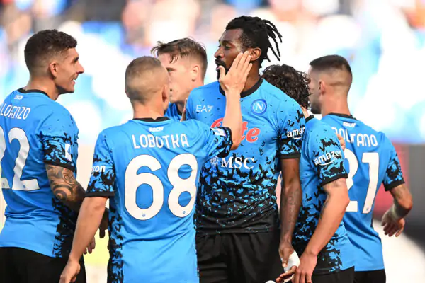 NAPLES, ITALY - OCTOBER 01: Andre Zambo Anguissa of SSC Napoli celebrates with teammates after scoring the second goal for his team during the Serie A match between SSC Napoli and Torino FC at Stadio Diego Armando Maradona on October 01, 2022 in Naples, Italy. (Photo by Francesco Pecoraro/Getty Images)