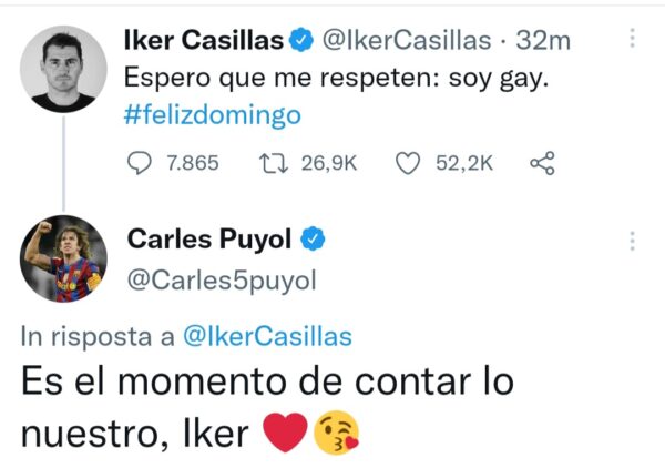 A rispondere al Tweet di Iker Casillas sulla sua omosessualità è dunque l’ex capitano del Barcellona, attraverso il suo profilo ufficiale. Commenta così, Puyol: “Ora è il momento di raccontare la nostra versione, Iker”.