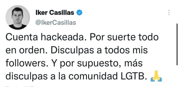Smentisce tutto quanto Casillas, dopo quanto era circolato su di lui a seguito del Tweet di questa mattina. Ecco, cos’ha scritto su Twitter, l’ex portiere del Real Madrid: “Mi hanno hackerato, per fortuna tutto è tornato al suo posto. Chiedo scusa ai miei follower e, scusa anche alla tutta la comunità LGTB”.