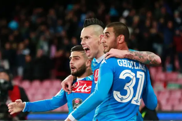 Napoli's Slovak forward Marek Hamsik (C) celebrates with teammates Napoli's Italian forward Lorenzo Insigne (L) and Napoli's Algerian defender Faouzi Ghoulam after scoring during the Italian Serie A football match SSC Napoli vs Torino FC on January 6, 2016 at the San Paolo stadium in Naples. AFP PHOTO / CARLO HERMANN / AFP / CARLO HERMANN (Photo credit should read CARLO HERMANN/AFP via Getty Images)